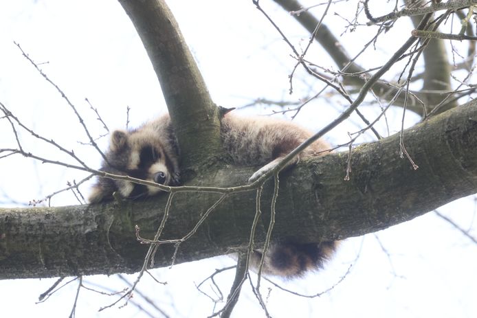 De slapende wasbeer die al dagen huist in een boom in vught is door een dierenarts uit de boom geschoten.